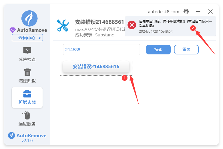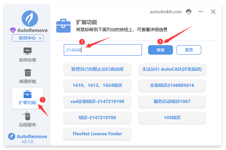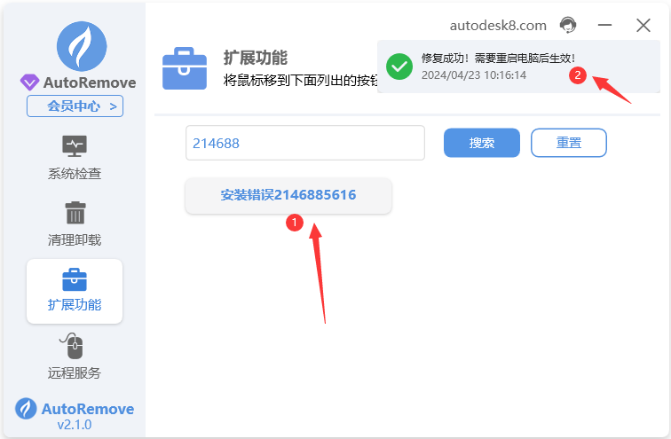 1. 打开autoremove,点击扩展功能,搜索2146885616点击搜索