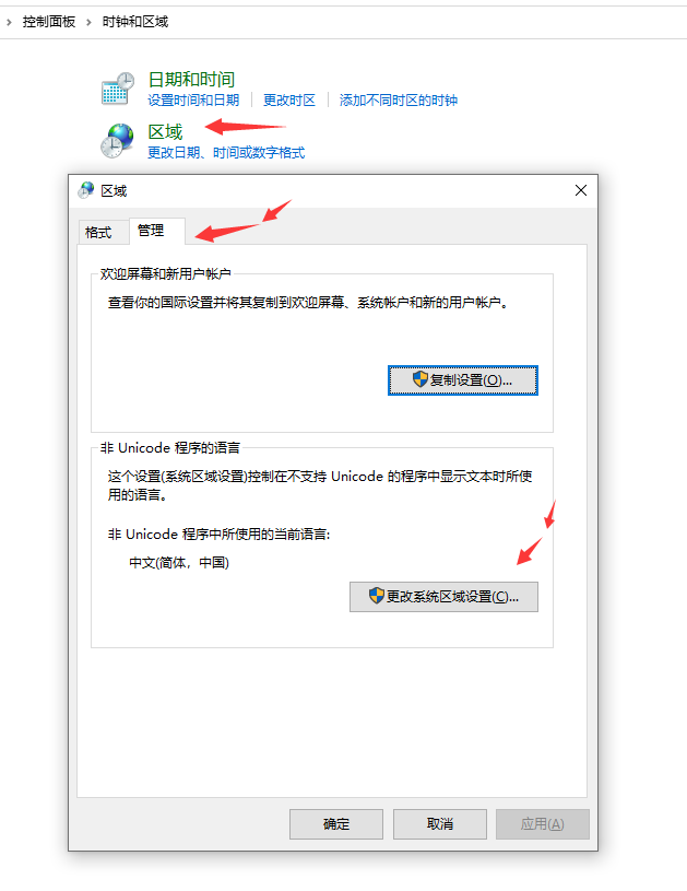 点开区域,更改系统区域设置,