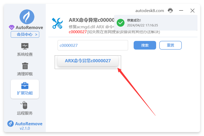点击autoremove扩展功能,输入c0000027点击搜索,然后双击出现的这个按钮既可。