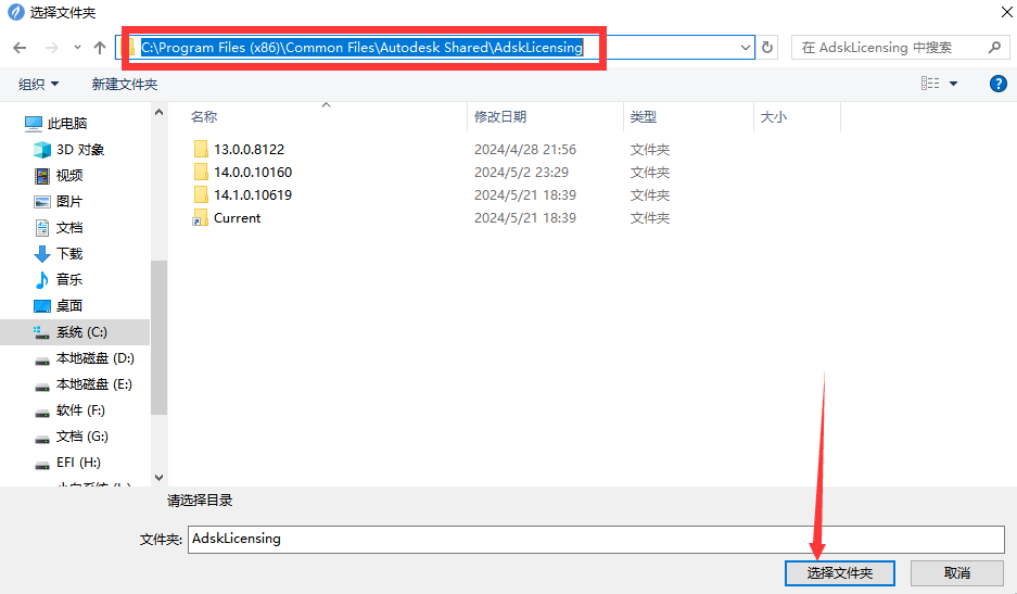 3.在弹出的窗口里进入这个目录C:\Program Files (x86)\Common Files\Autodesk Shared\AdskLicensing如图,点击选择文件夹