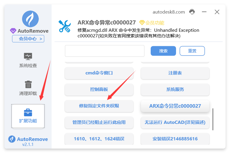 打开autoremove,点击扩展功能,点击 修复指定文件夹权限