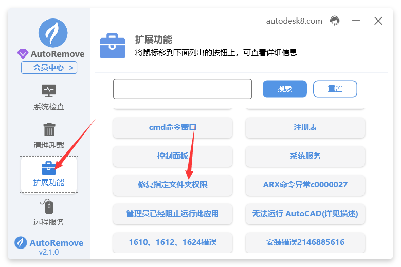 2.然后点击autoremove扩展里面的cad致命错误(操作时)按钮